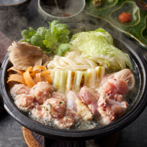 名古屋コーチンを詰め合わせた鍋セットです。お好みで豆腐や野菜などを加えて名古屋コーチンをお楽しみください。骨付き肉から出た出汁まで味わっていただきたいため、〆にきしめんをご用意しました。2~3人前です。