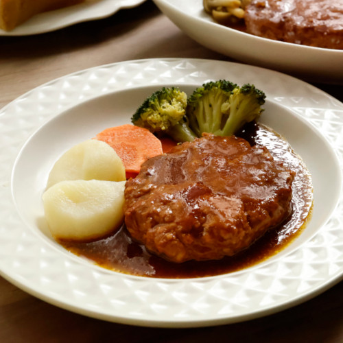 じっくりと煮込んだ「やわらか鎌倉煮込み」角煮とハンバーグのセットです。湯煎するだけの簡単調理です。
