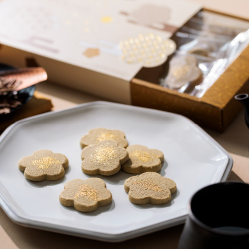 加賀棒茶の粉末を配合した香ばしい棒茶の香りのショコラ。ショコラの色は加賀棒茶本来の自然な色です。ほろっとした食感の口どけのいいショコラです。そのままでも冷蔵庫で冷やしてから食べるのもおすすめです。金箔がきらっと輝きます。