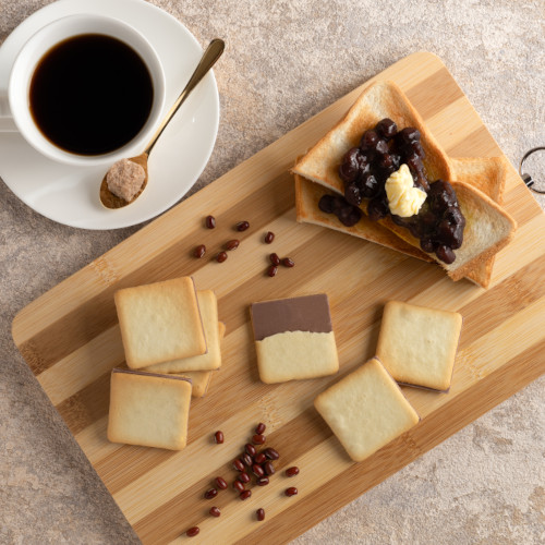 小倉トーストをイメージし、小倉あんチョコをトーストに見立てた薄焼きクッキーでサンドしました。