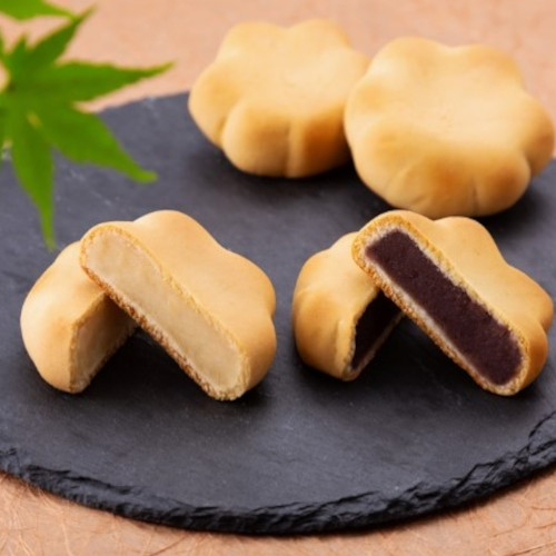 芳醇なバターの香りがひろがるしっとりとした生地に、とろけるようなくちどけのあんを包んだもみじ饅頭です。しっとり柔らかな特製のあんに生クリームを練り合わせた優しい味わいのミルクあんと、甘さ控えめのこしあんの2種類を詰合せました。
