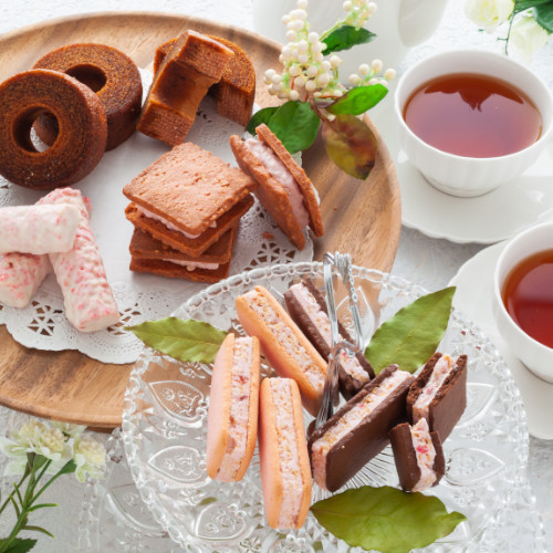 表面に香ばしいキャラメリゼをしたあまおうバウムクーヘン、あまおう苺のふんわりクリームをアーモンド入りの生地で挟んだサンドクッキー、ドライ苺入りのホイップチョコをサクサクのクッキー生地とココア生地でそれぞれサンドした苺きらら、あまおうショコラサンドクッキー、クランチ生地をホワイトチョコで包み込んだクランチショコラバーあまおう。あまおう苺を贅沢に使用したスイーツのセットです。