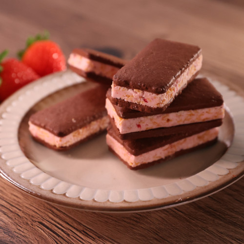 あまおう苺を贅沢に使用した甘酸っぱいホイップチョコレートを、ほんのりビターなココア生地でサンドしました。ホイップチョコレートに練り込まれたコーンフレークと、クッキー生地によるサクサクの食感が楽しめます。