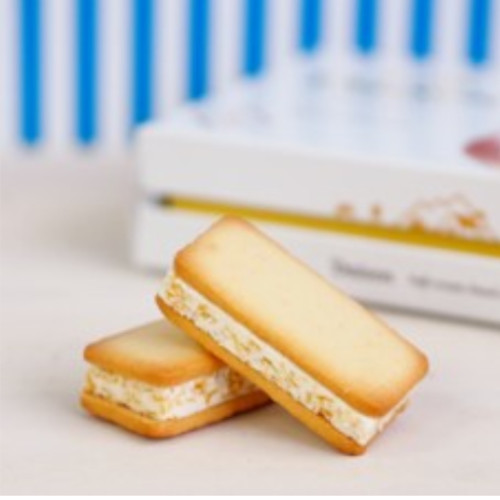鳥取県産牛乳を使用したクッキー生地に、ソフトクリーム風味のエアチョコをサンド。コーンフレークが練り込まれたエアチョコのザクザク食感も楽しいサンドクッキーです。