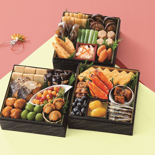 ■内容量:田作り20g、丹波黒黒豆60g、ふきのうま煮50g、里芋含め煮4個、たたきごぼう70g、にしん一口巻昆布6本、栗きんとん70g、味付しいたけ5枚、穂先竹の子3切、なます50g、真たらこ角煮70g、鰆の柚庵焼2切、焼ほたて3個、子持ちいかのうま煮3個、だし巻150g、手綱こんにゃく4切、高野豆腐含め煮6切、祝海老3尾、あさりのうま煮60g、若桃甘露煮5個、紅白豆マリネ65g、照焼つくね60g