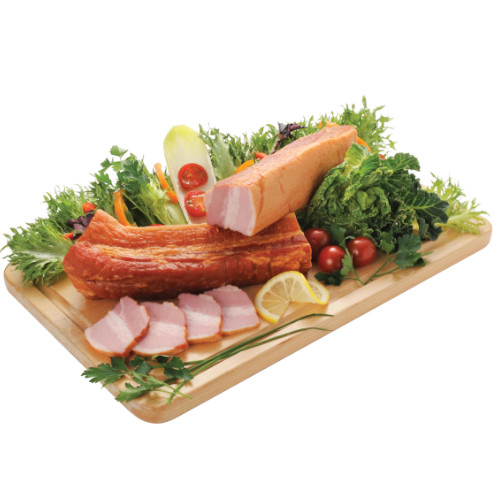 細長く切り、つるして全面にスモークをかけたベーコンです。豊かなスモークの香りと味わいをあらぎりわさびと一緒にお楽しみください。