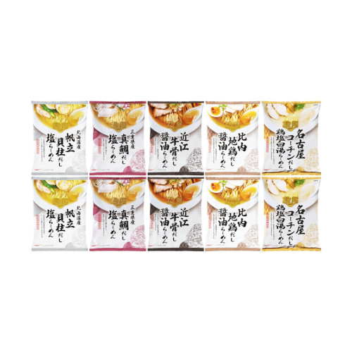 ■内容量:醤油らーめん(比内地鶏だし101g、近江牛骨だし113g) ×各2、塩らーめん(北海道産帆立貝柱だし112g、三重県産真鯛だし110g) ×各2、鶏塩白湯らーめん(名古屋コーチンだし107g)×2