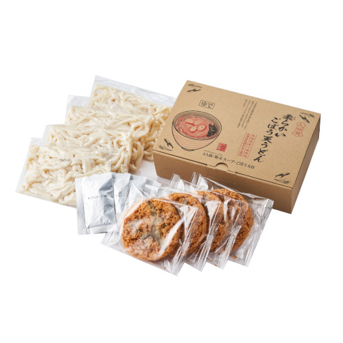 長崎県産小麦を使用した柔らかく仕上げたうどん、長崎県産の焼きあごだしを使用したスープ、香ばしいサクサクとした食感のごぼう天のセット。